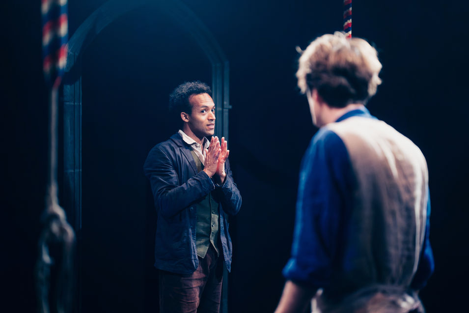 “Natalie Johnson’s set is marked by a wooden minimalism: gothic rampant arches and slatted benches with ropes hanging off the ceiling are everything Hall’s project needs..” - Broadway World